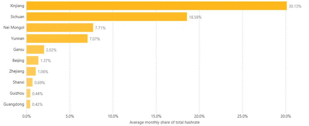 About 53% of Bitcoin’s hash rate was accounted for in the three Chinese provinces Xinjiang, Sichuan and Inner Mongolia based on Cambridge research.
