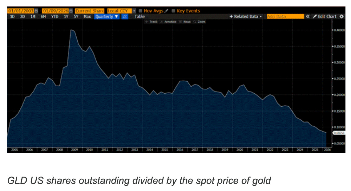In fact almost all the gold demand from the last few years has been from Central Banks. The below December 2025 Goldman Sachs exhibit suggests limited ETF demand since 2022 and steadily increasing Central Bank demand.