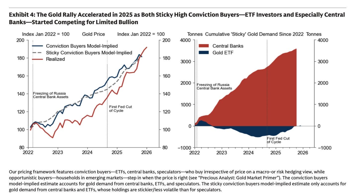 In fact almost all the gold demand from the last few years has been from Central Banks. The below December 2025 Goldman Sachs exhibit suggests limited ETF demand since 2022 and steadily increasing Central Bank demand.
