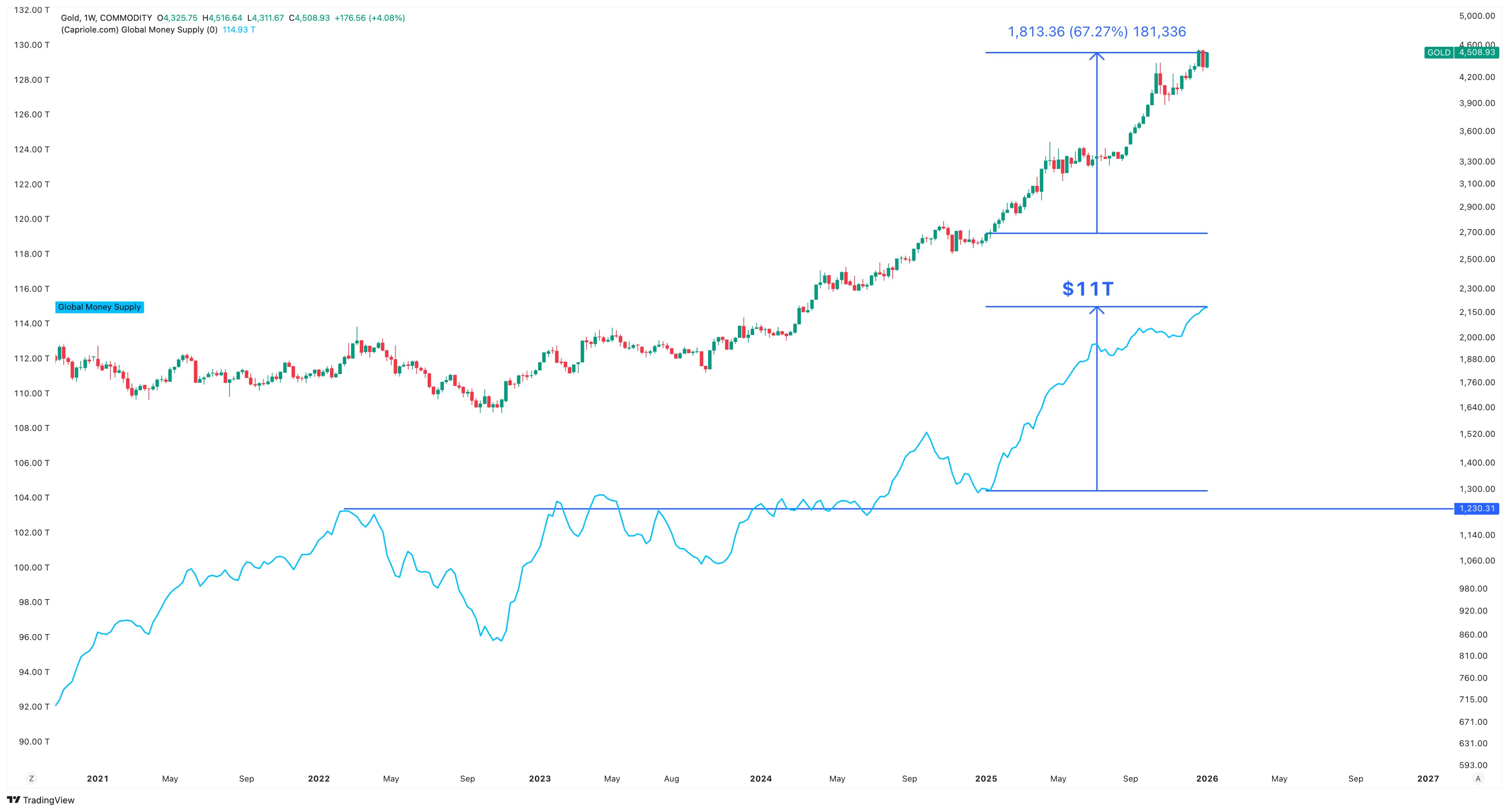 Global money supply grew $11T in 2025 to $115T. Is it any surprise that Gold also grew by $14T (67%)?