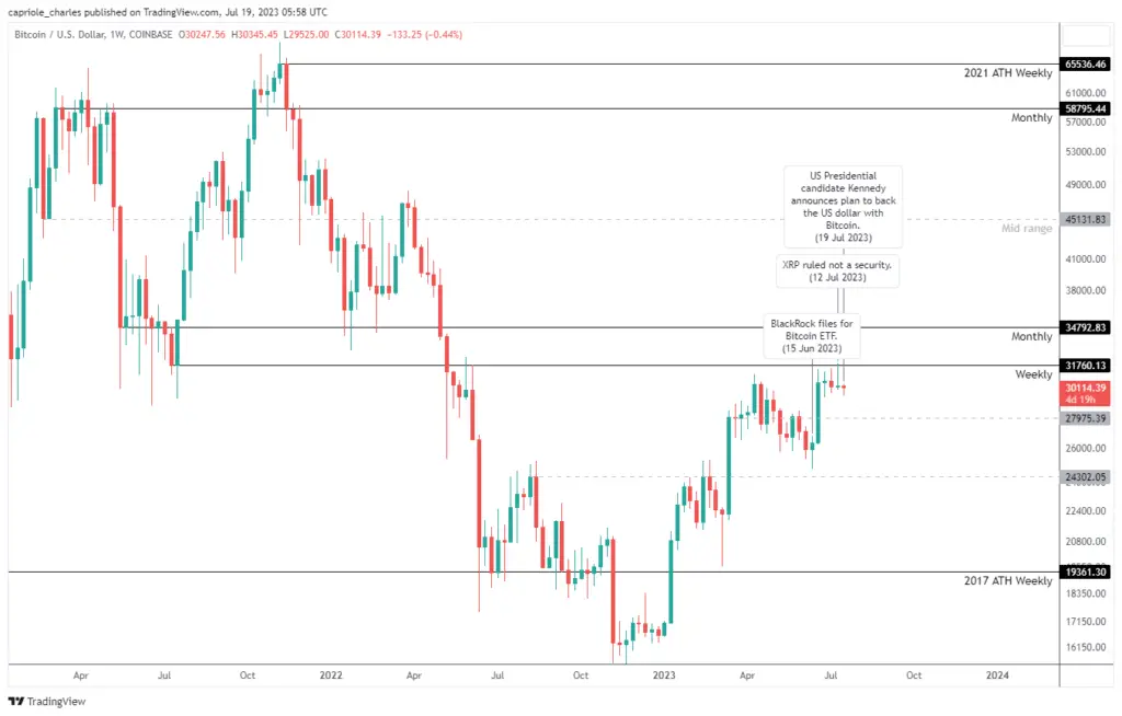 High Timeframe Technicals: Despite a series of perhaps the best crypto news in years, Bitcoin has failed to break out of weekly resistance at $32K. Suggesting a greater area of opportunity on a $32K break or reversion to the mid-$20Ks. Interactive Chart here.
