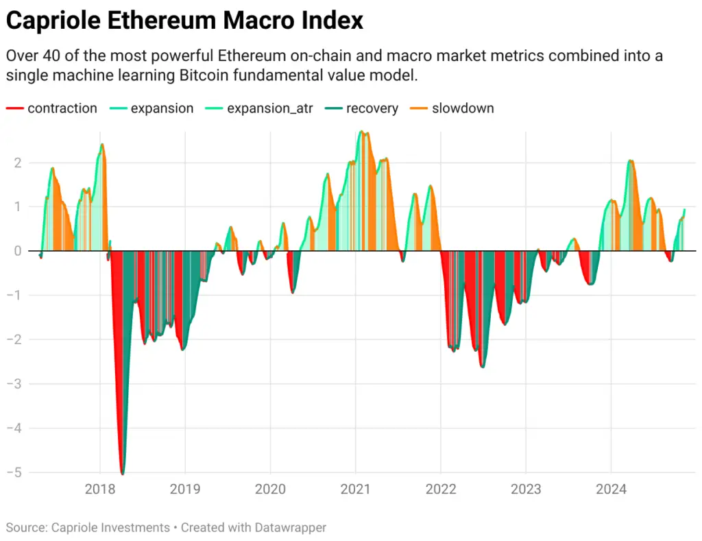 The collective picture as shown through Capriole’s machine learning fundamentals model Bitcoin Macro Index. This Index includes over 60 of the most powerful Bitcoin on-chain, macro market and equities metrics combined into a single machine learning model. It is a pure fundamentals-only value investing approach to Bitcoin, where price isn’t an input.